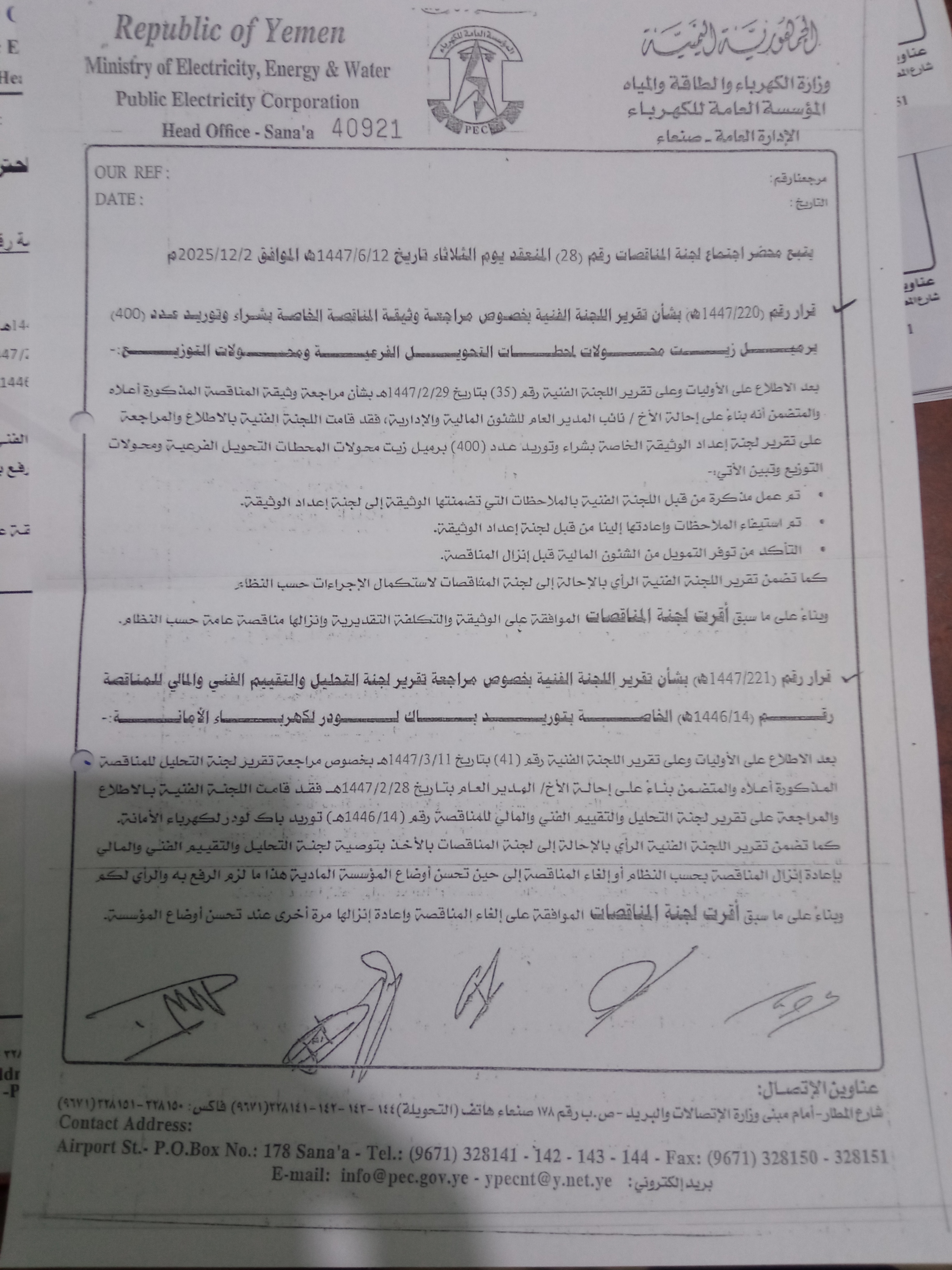 مكان الحصول على وثائق المناقصة: المؤسسه العامه للكهرباء -اداره المناقصات بالاداره العامه للمشتريات -الدور الثالث