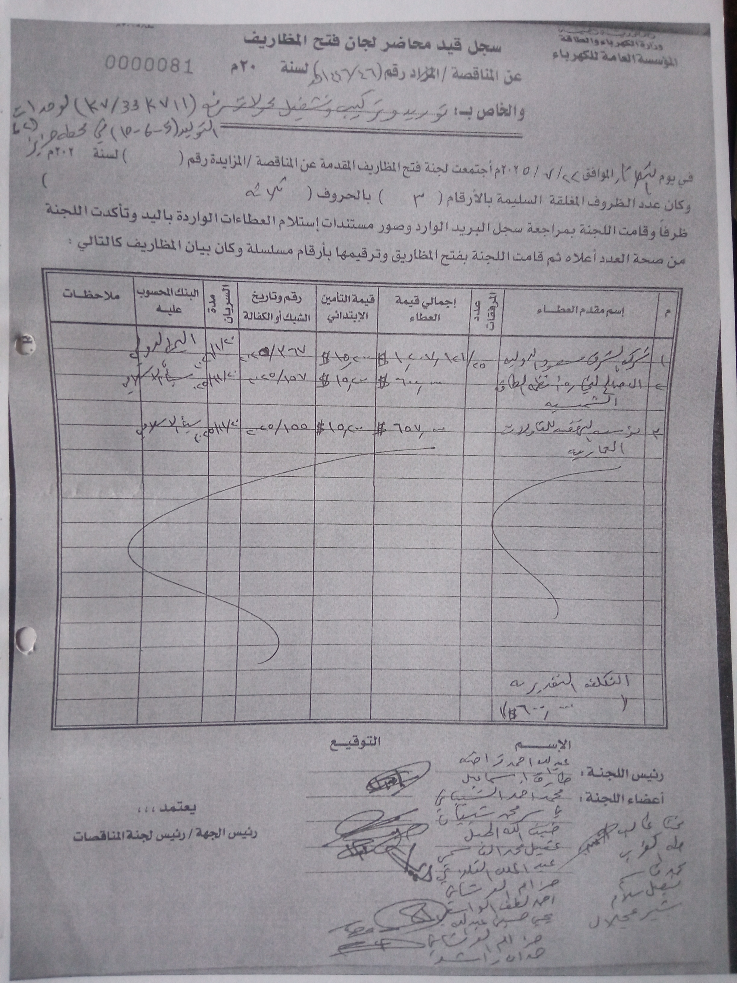 عنوان المناقصة: توريد وتركيب وتشغيل محولات رفع (kv11/kv33) لوحدات التوليد (5-6-10) في محطه حزيز (2&3)