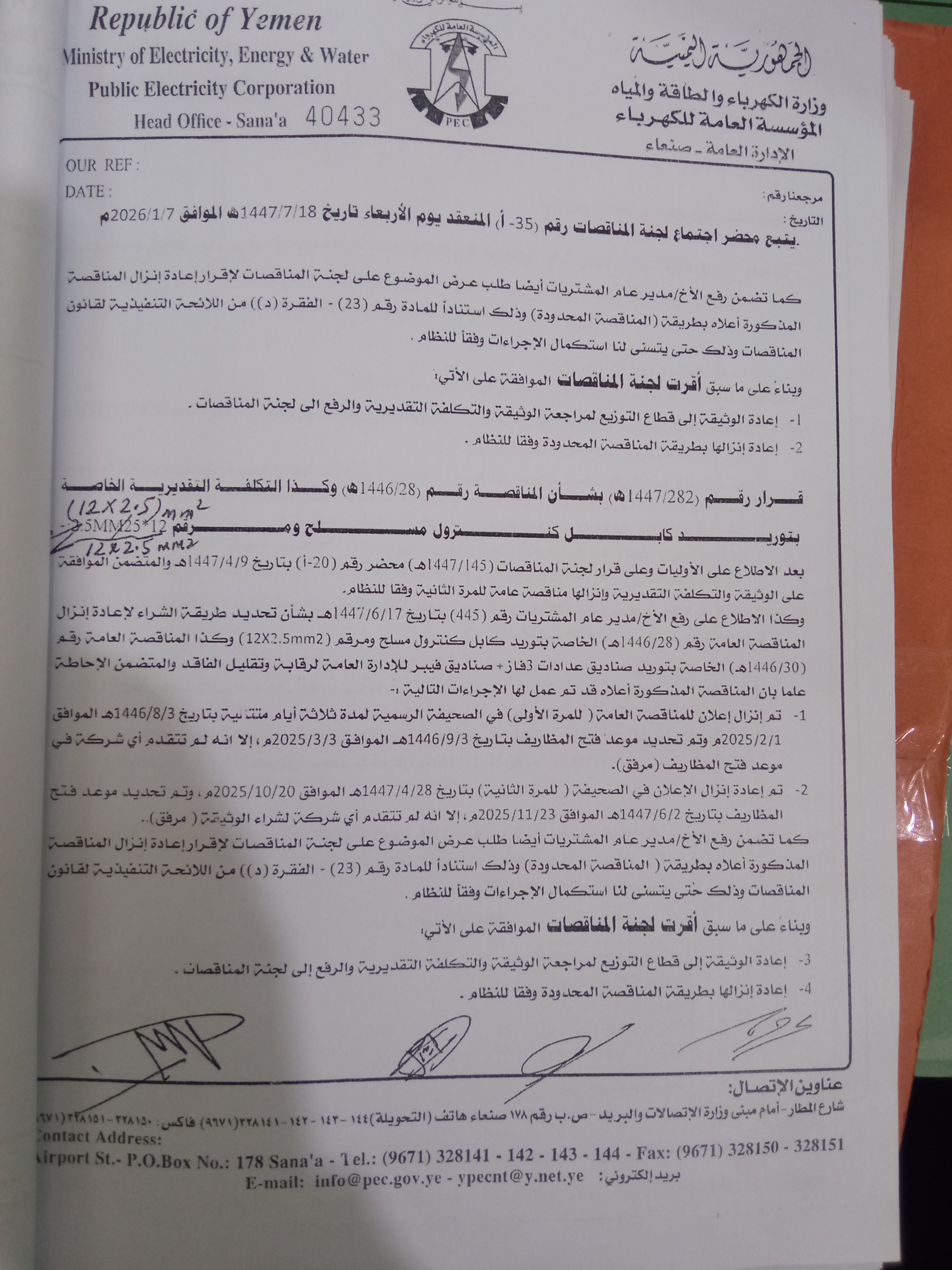 عنوان المناقصة: توريد كابل كنترول مسلح ومرقم 12.*2.5 للاداره العامه للرقابه وتقليل الفاقد