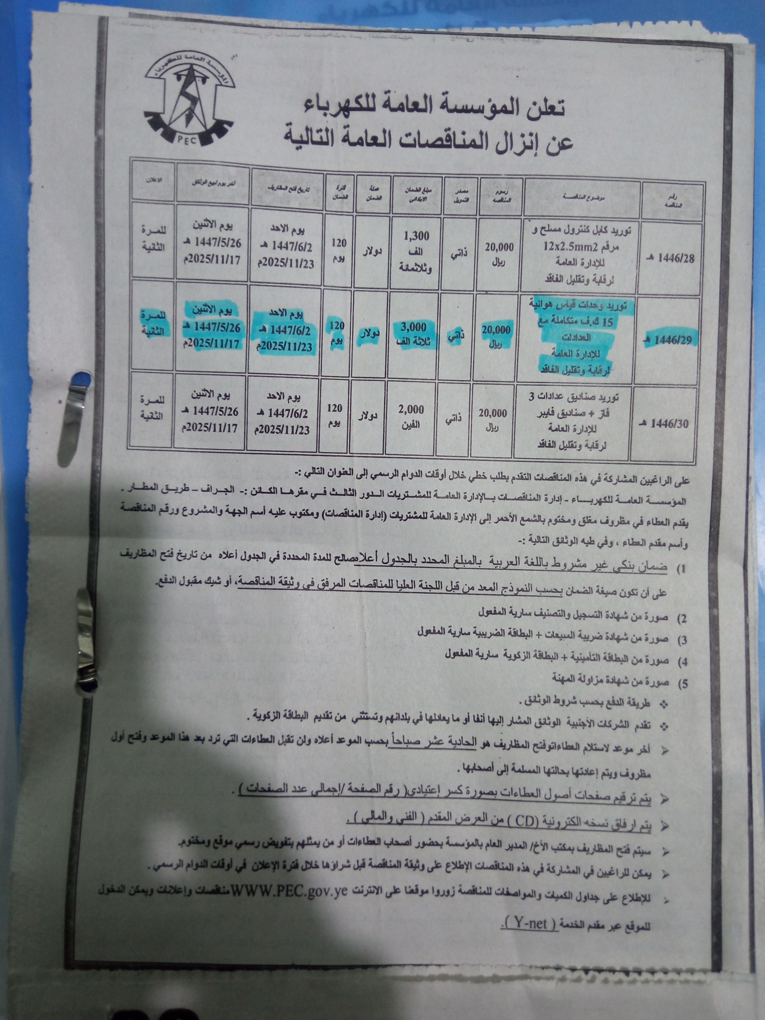 مكان الحصول على وثائق المناقصة: المؤسسه العامه للكهرباء -اداره المناقصات -بالاداره العامه للمشتريات الدور الثالث